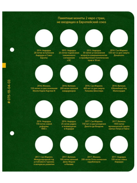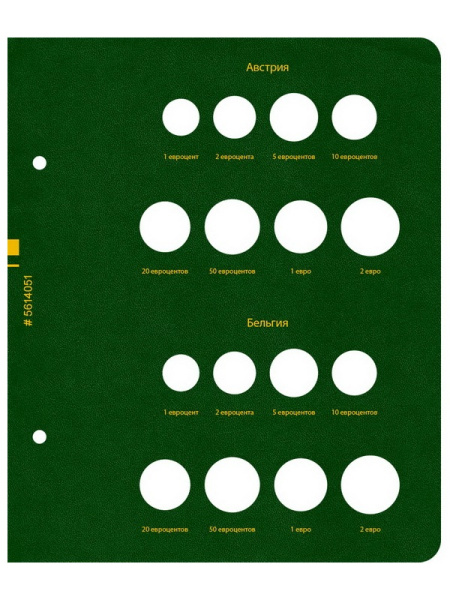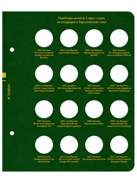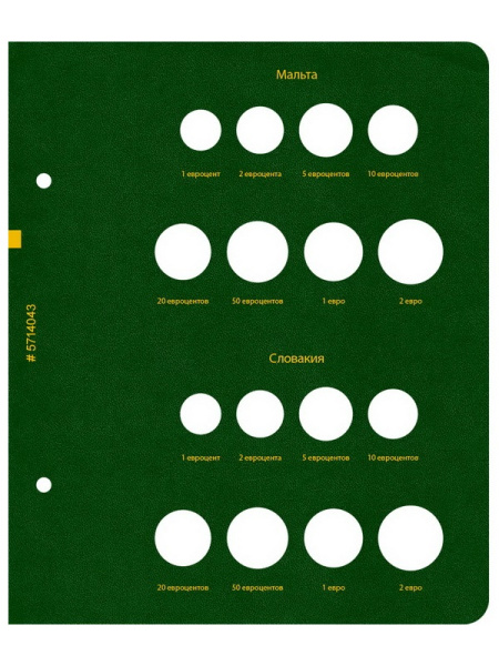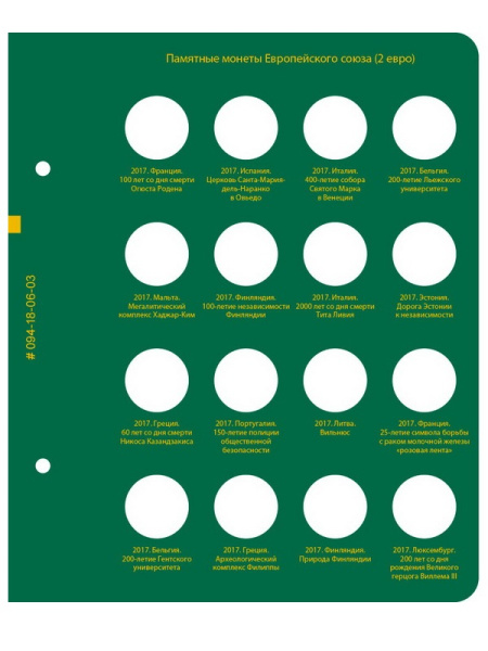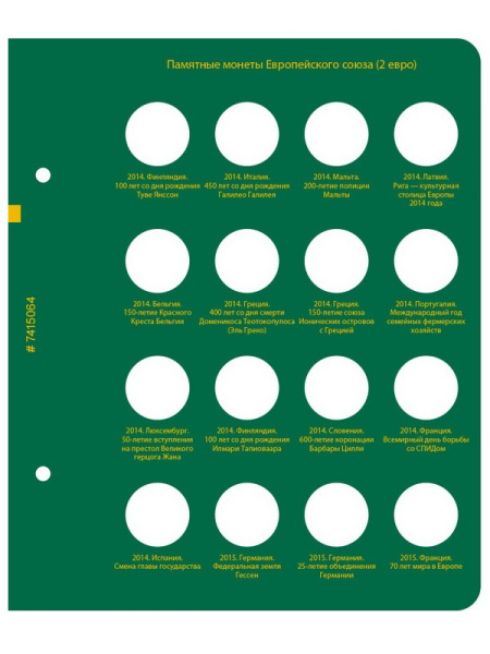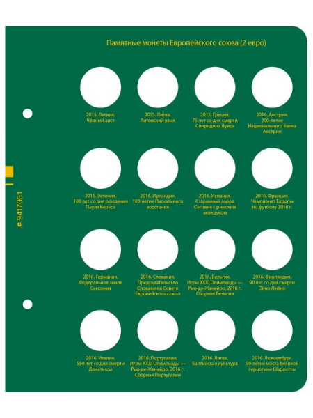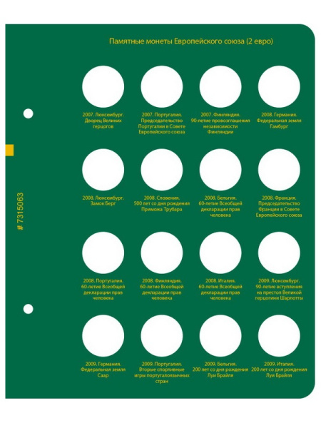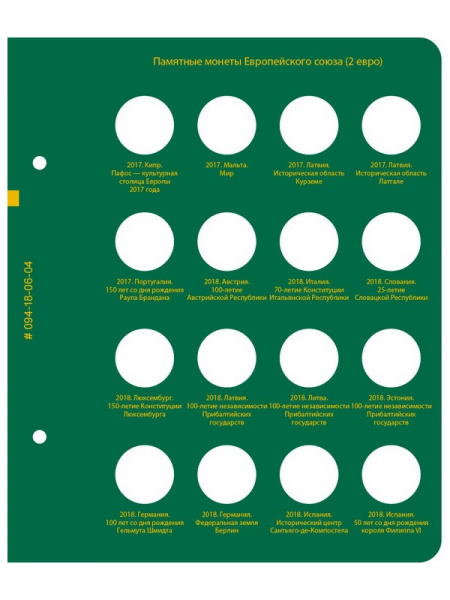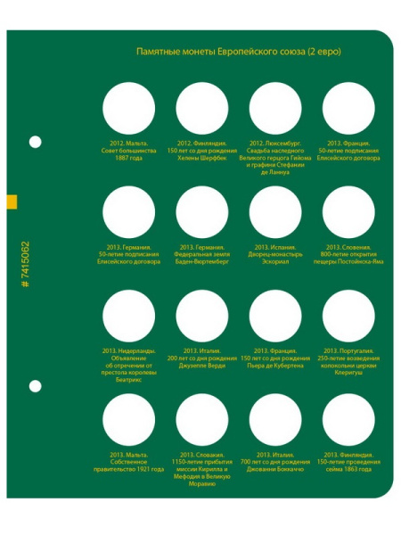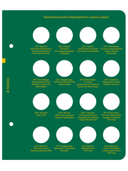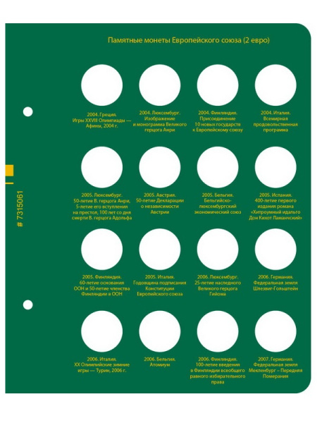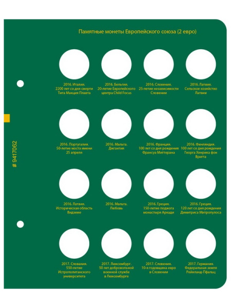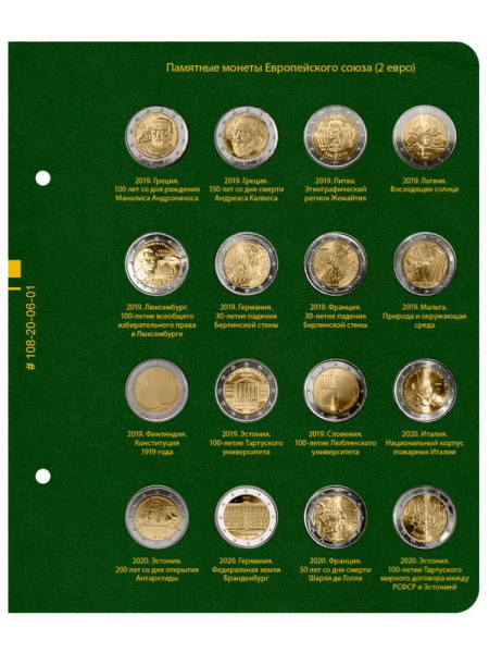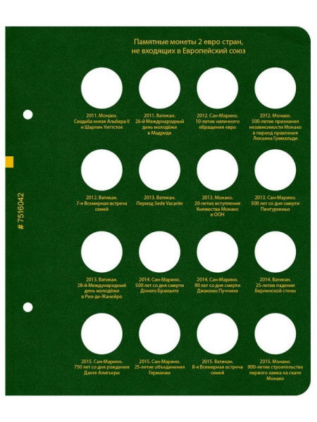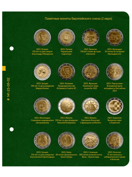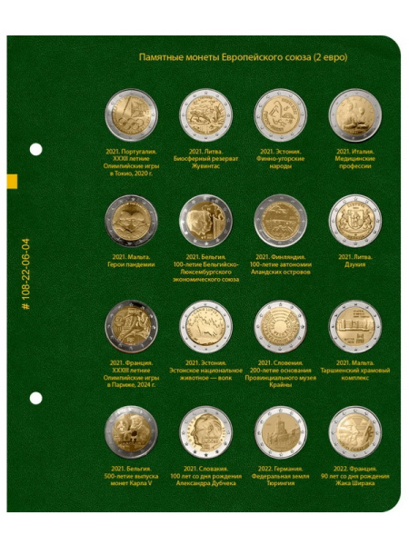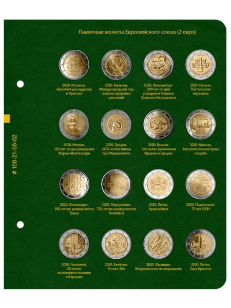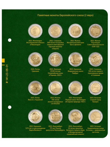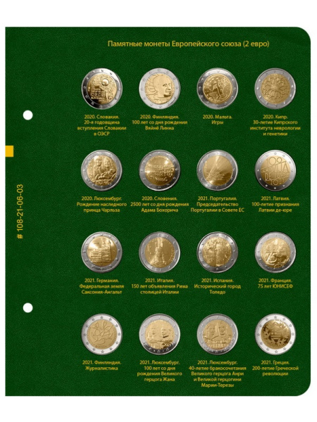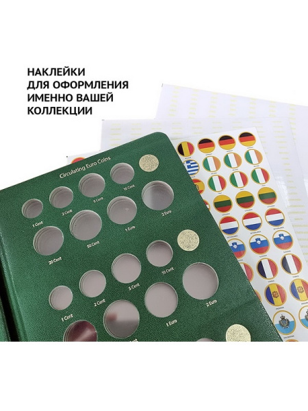 Альбомы рассчитаны на разное количество евро (до 180 штук номиналом 2 евро) и разные номиналы евро монет (от 21 до 25 полных наборов курсовых монет).