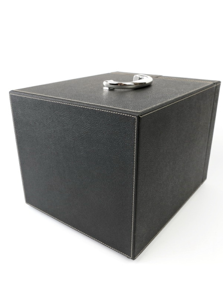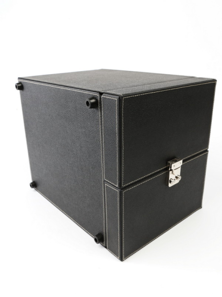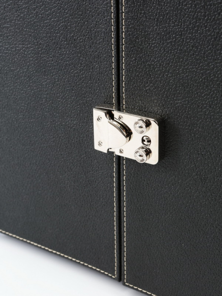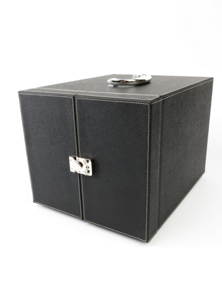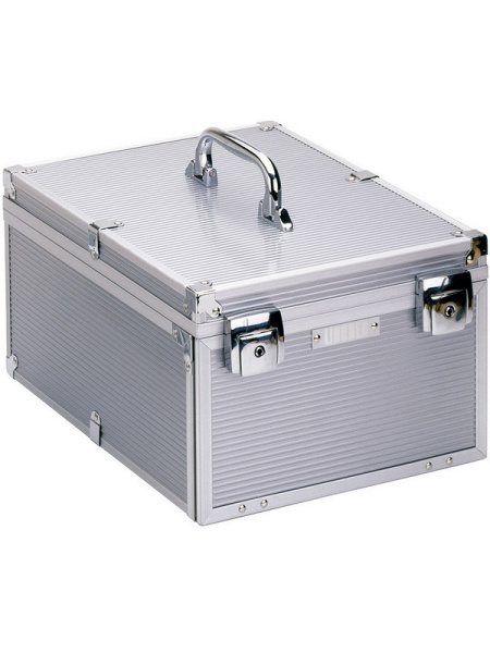 Сверху на крышке предусмотрена складная ручка, что позволяет легко переносить или транспортировать кофр для монет. Также имеется замок, надежно защищающий содержимое.