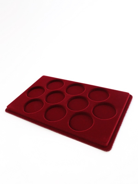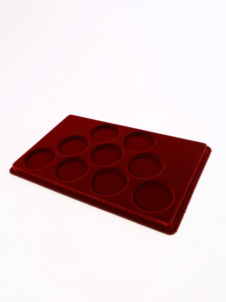 Основанием планшета служит пластиковый корпус, покрытый бархатом. Цветовая палитра материала может быть самой разнообразной. Мы предлагаем флок черного, зеленого, темно-синего, темно-бордового оттенка. Коллекционные монеты в капсулах на цветной подложке смотрятся более презентабельно, что привлекает дополнительное внимание и значительно повышает их ценность.