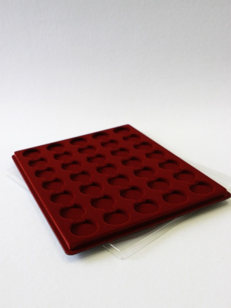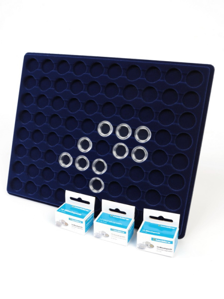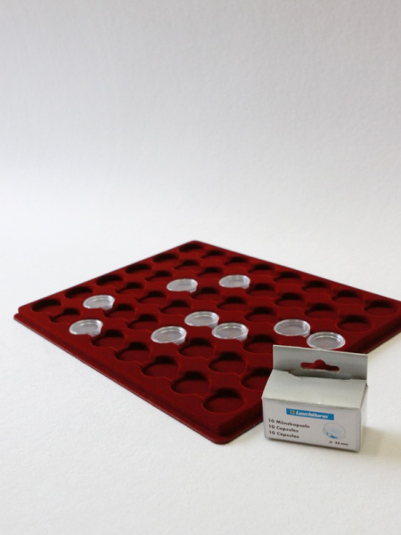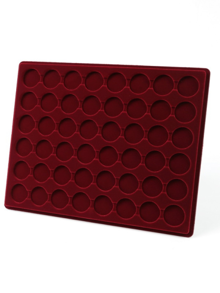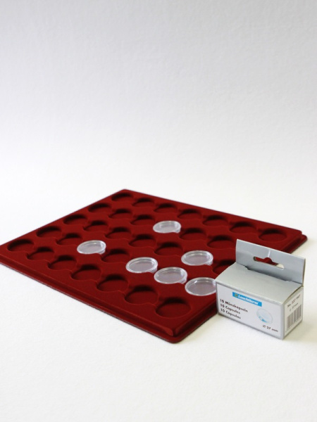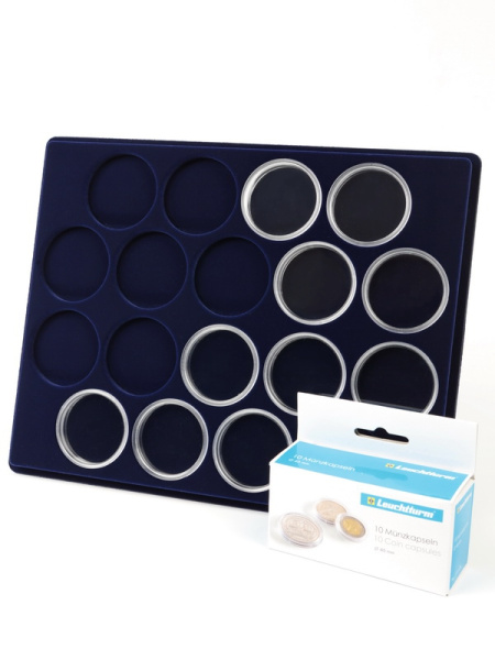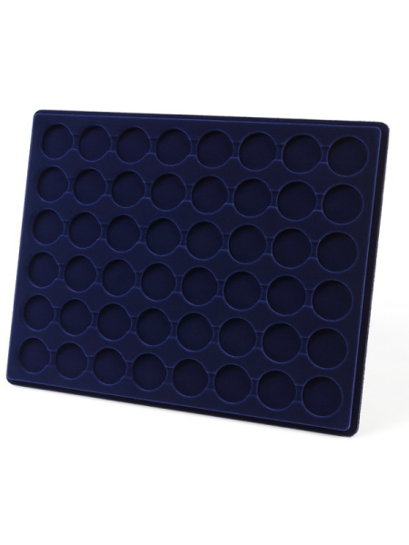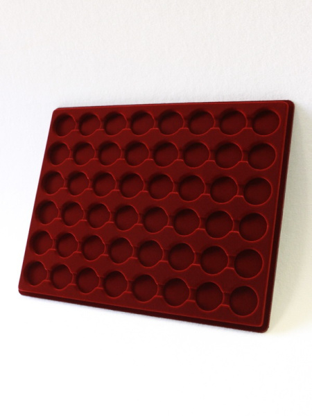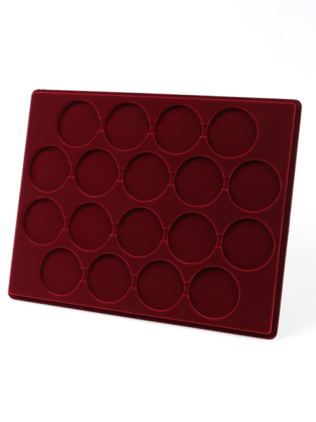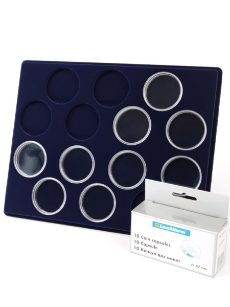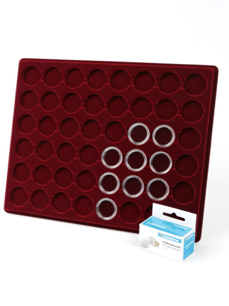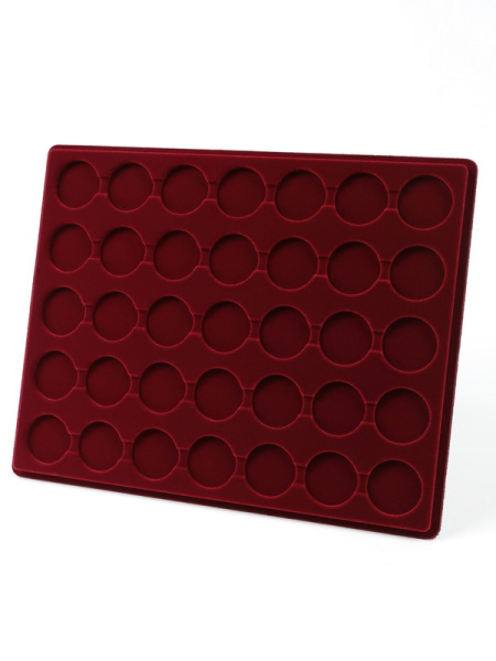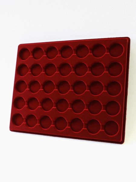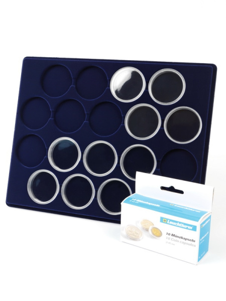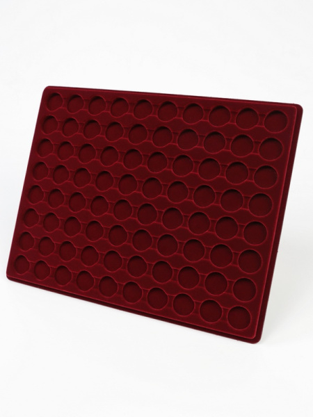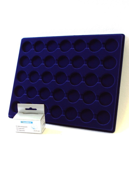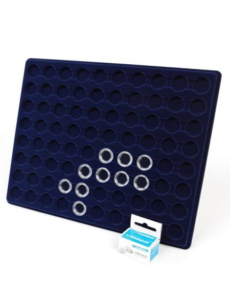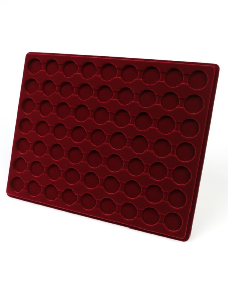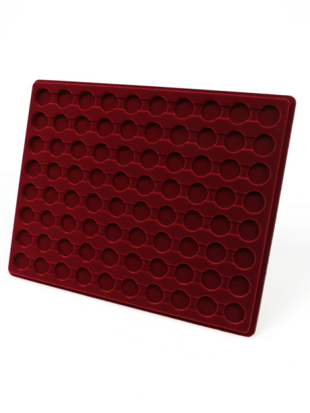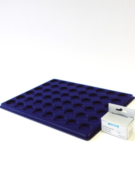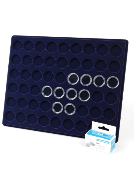 Планшеты с круглыми ячейками для монет в капсулах позволяют разместить внутри до нескольких десятков коллекционных экземпляров. Число предметов, которые могут находиться в планшете, определяется параметрами внешнего диаметра капсул. Одна упаковка способна вместить от 3 до 80 монет.