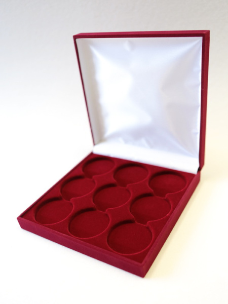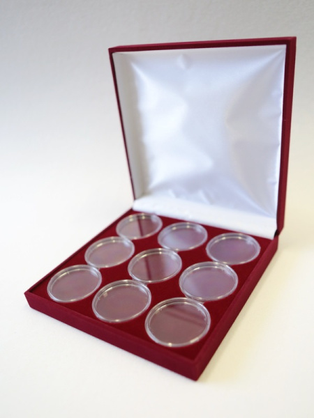 Футляр предназначен для 9 монет в капсулах. Внешний диаметр капсул 46 мм