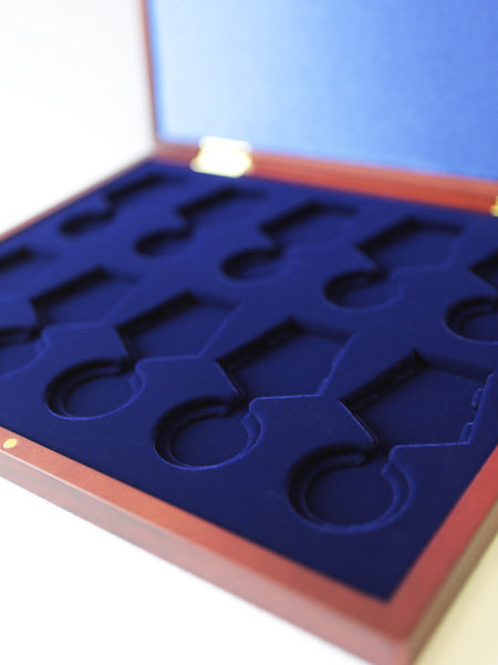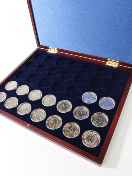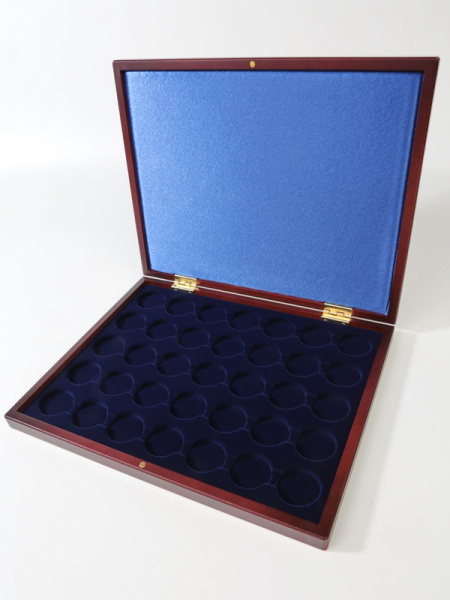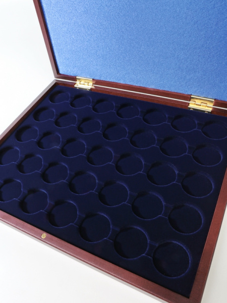 Футляр предназначен для хранения 35 капсул Leuchtturm (CAPS 26,5 и 27). Также может подойти для монет в других капсулах. Внешний диаметр капсулы должен быть не более 33 мм.