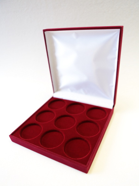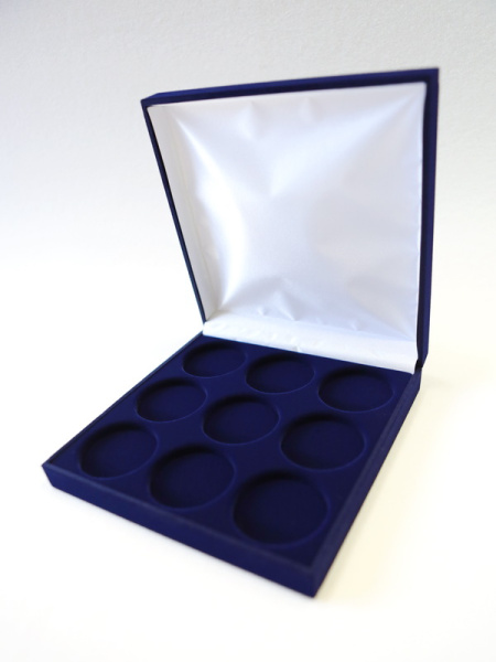 Футляр предназначен для 9 монет в капсулах. Внешний диаметр капсул 44 мм