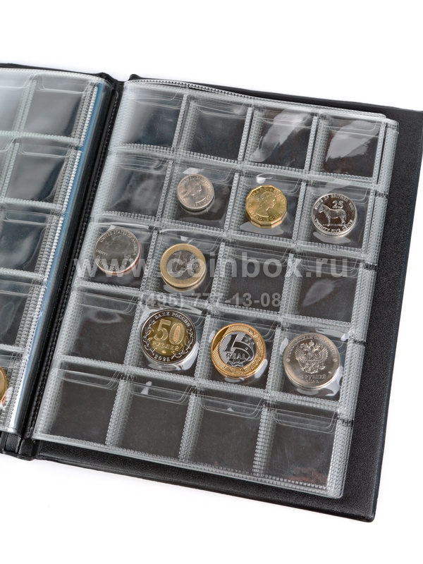 Альбом оснащён 10 листами с клапанами (кармашками) для хранения 200 монет диаметром до 30 мм.