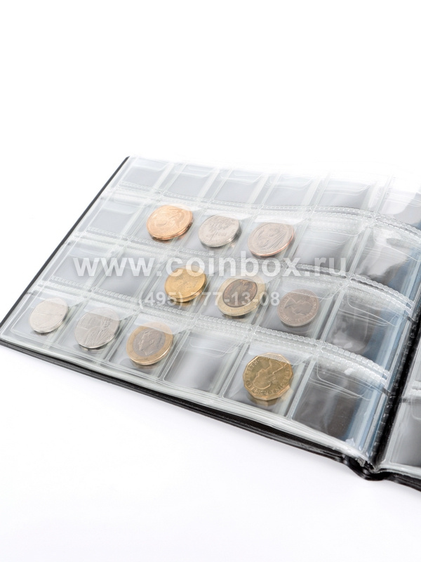 Альбом оснащён 10 листами с клапанами (кармашками) для хранения 240 монет диаметром до 27 мм.