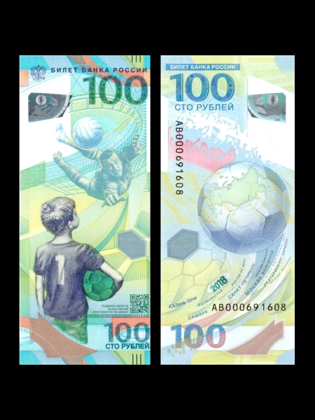 Банкнота 100 рублей к Чемпионату мира по футболу была выпущена Центробанком России 22 мая 2018 года. Главная особенность этой коллекционной банкноты – впервые в России денежный знак изготовлен из пластика. Это придает ему уникальные свойства и делает в два с половиной раза долговечнее бумажных сторублевок.