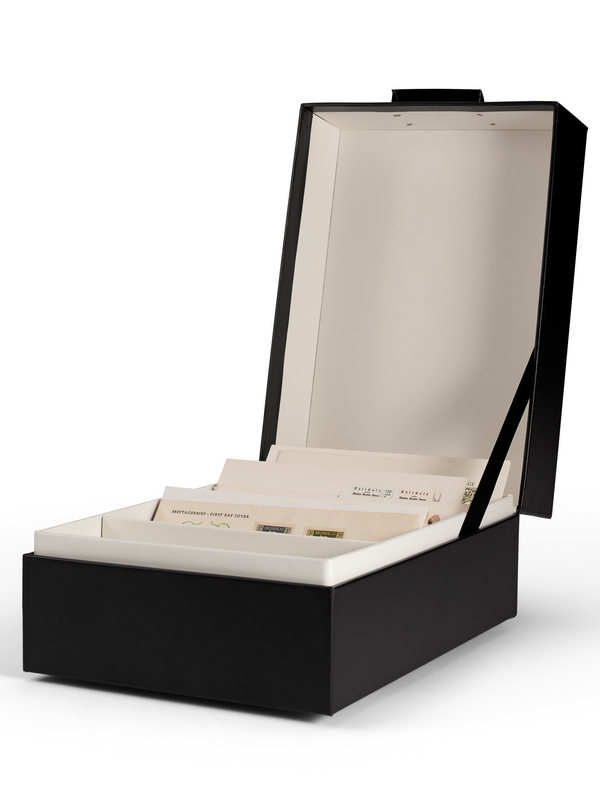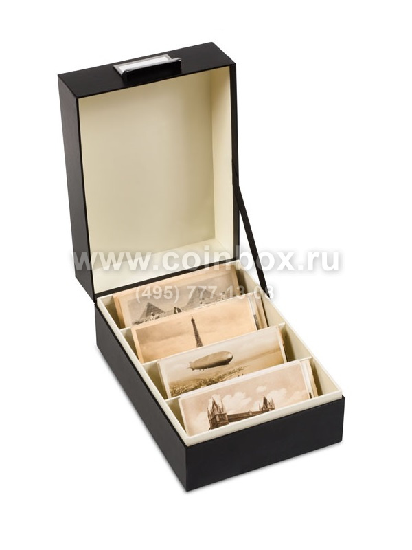 Бокс чёрного цвета для архивации почтовых открыток, писем, наборов монет, банкнот и других предметов коллекционирования.