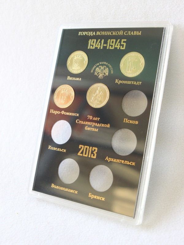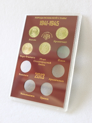 Буклет содержит набор памятных монет Центрального Банка Российской Федерации "Города Воинской Славы" 2013 года выпуска
