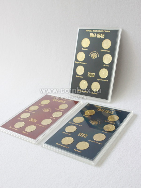 Буклет содержит набор памятных монет Центрального Банка Российской Федерации "Города Воинской Славы" 2013 года выпуска