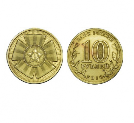 В центре диска — обозначение номинала монеты «10 РУБЛЕЙ». Внутри цифры «0» — скрытые, видимые поочерёдно при изменении угла зрения изображения цифры «10» и надписи «РУБ». По окружности вдоль канта — надписи, вверху: «БАНК РОССИИ», внизу — дата: «2010», слева — стилизованное изображение оливковой ветви, справа — дубовой.