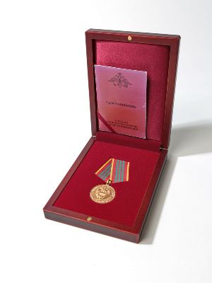 В футляр изготовлен флокированный ложемент с углублением под медаль РФ на пятиугольной колодке. Диаметр подвеса (медали): не более 32 мм.