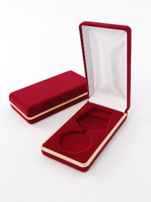 В футляр изготовлен флокированный ложемент с углублением под медаль РФ на пятиугольной колодке. Диаметр подвеса (медали): не более 37 мм.