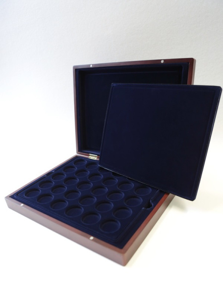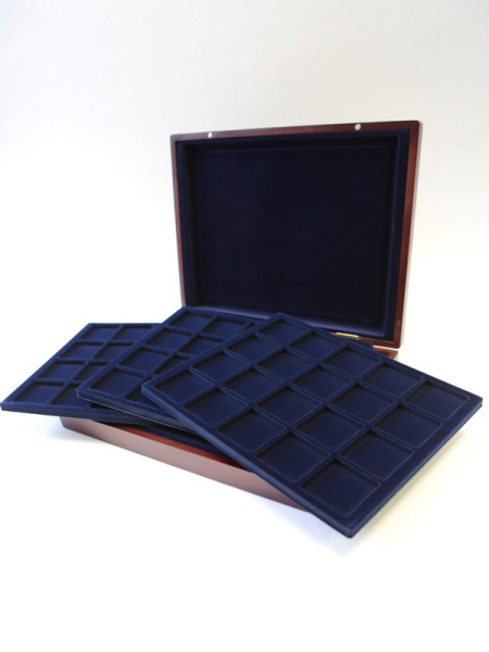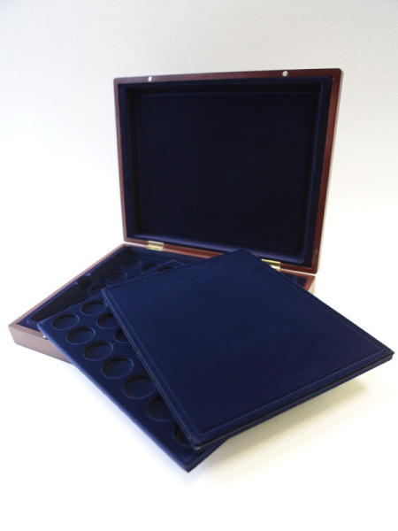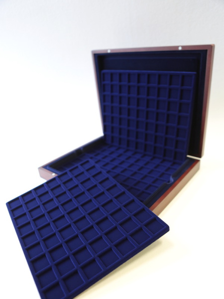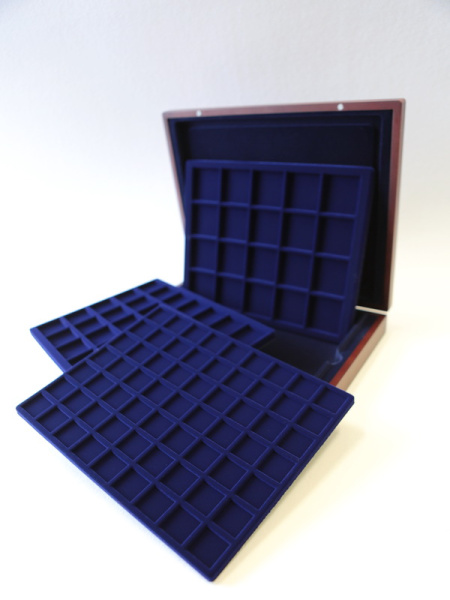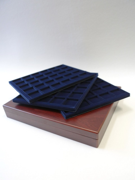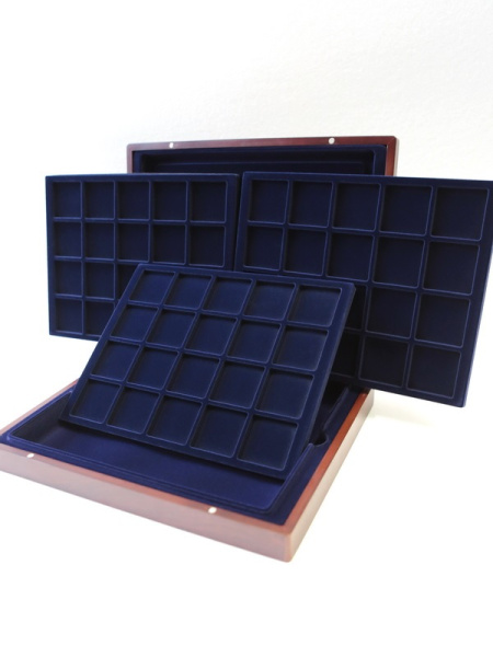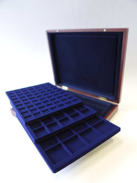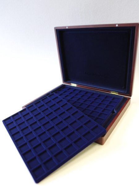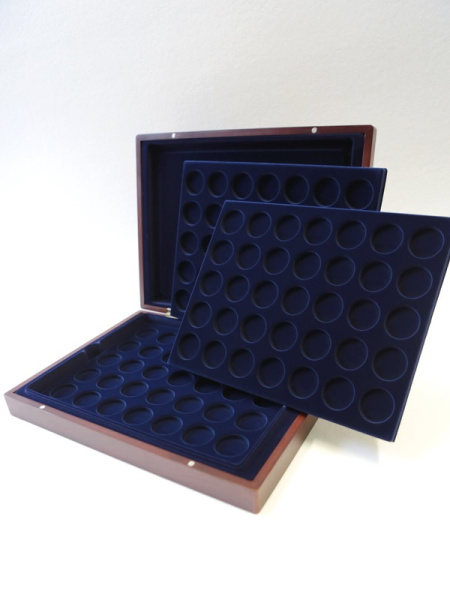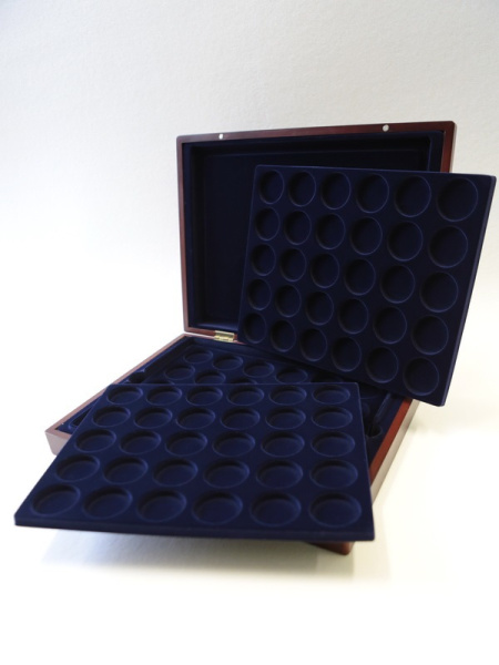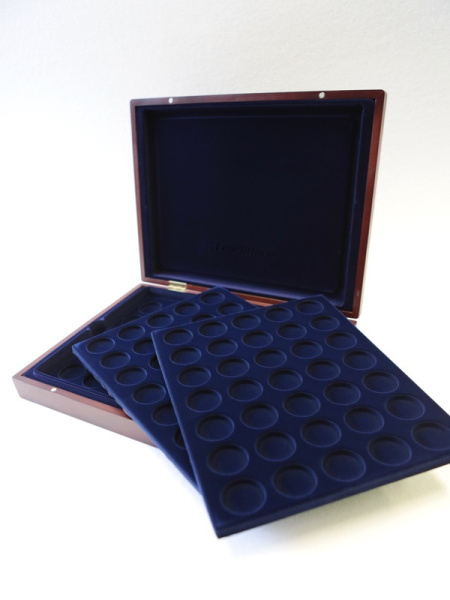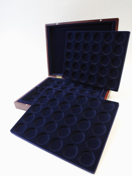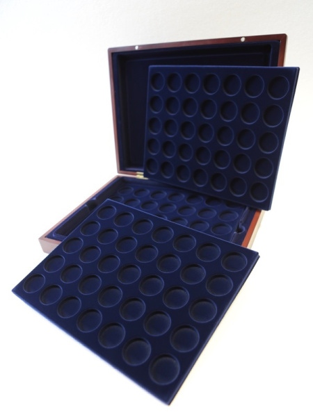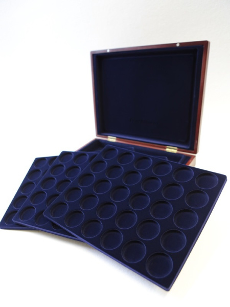 Деревянный футляр с 3 вставками для хранения 105 монет. Подходит для монет в капсулах и без них.