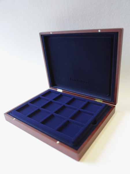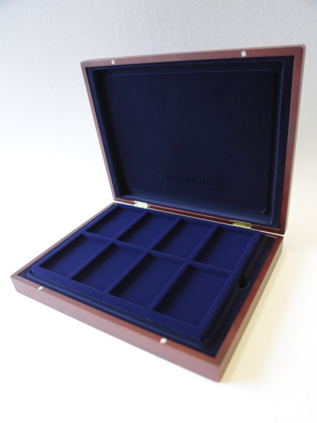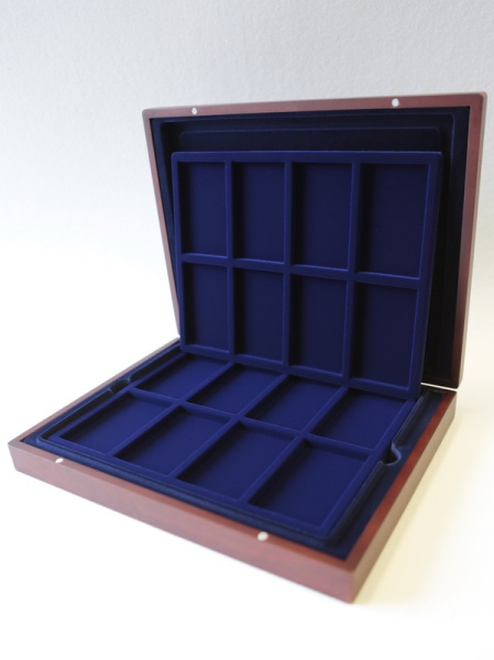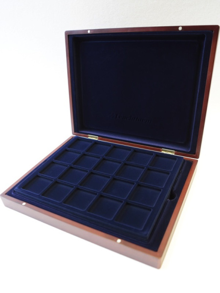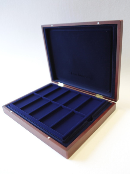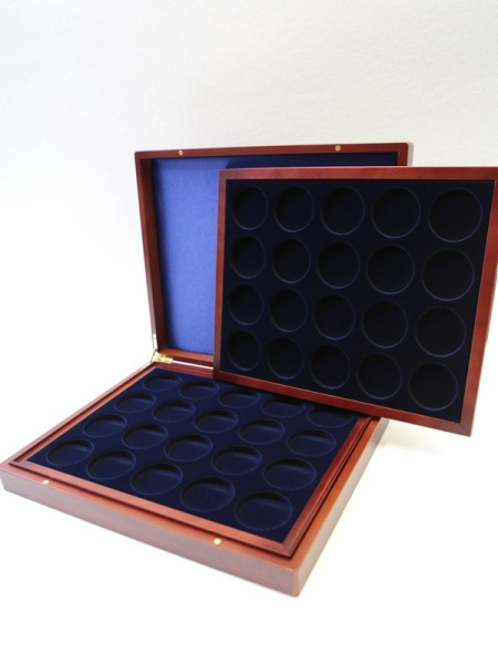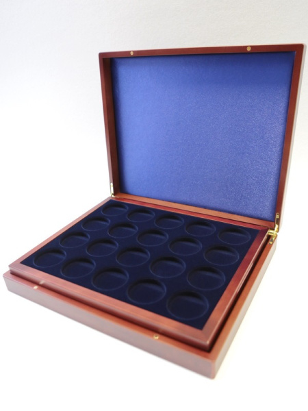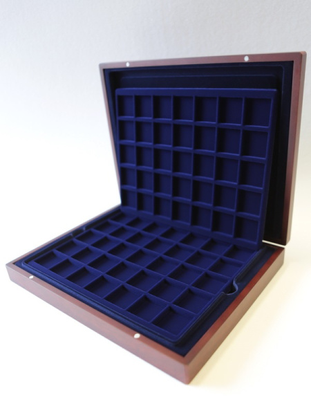 Деревянный футляр с 3 вставками для хранения 64 юбилейных медно-никелевых монет СССР с 1965 года выпуска по 1991 год. Монеты должны быть уложены в капсулы с внешним диаметром 44 мм