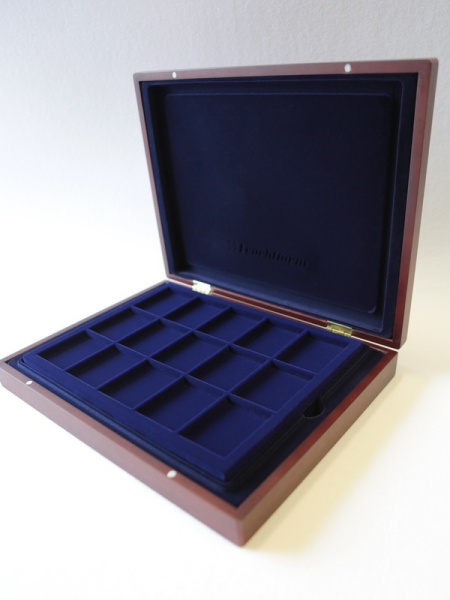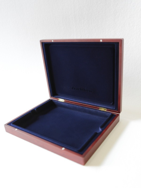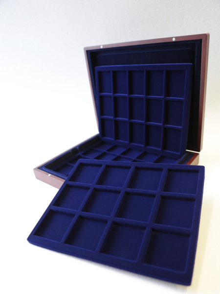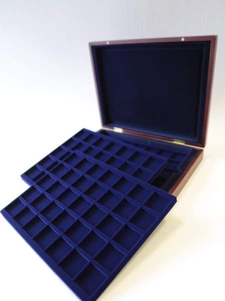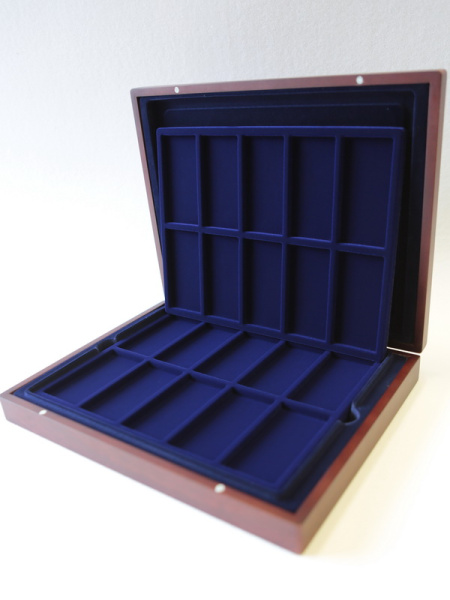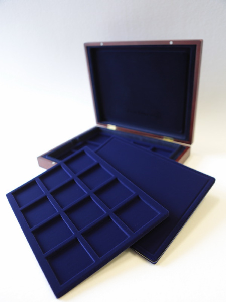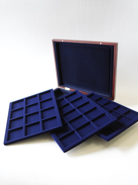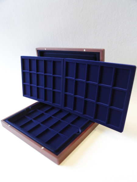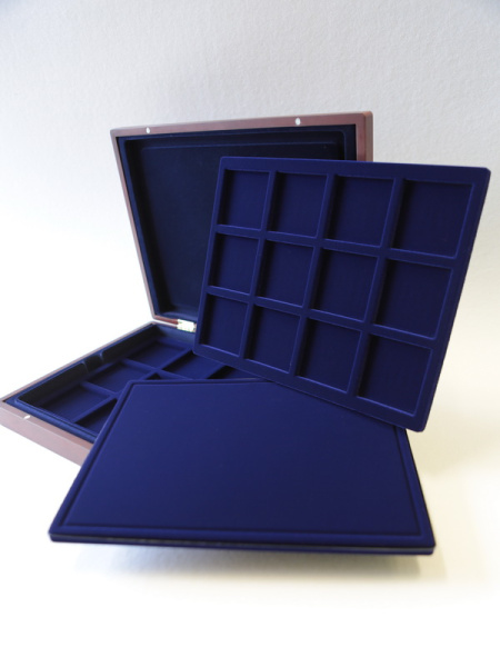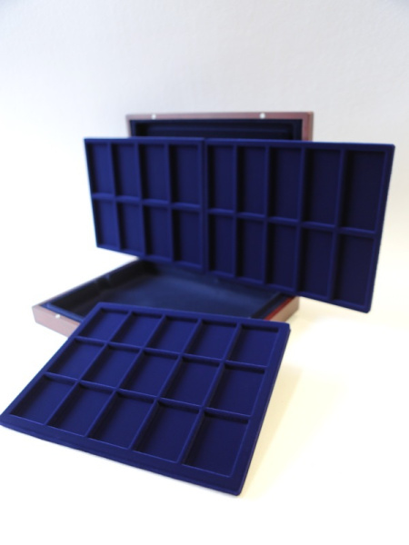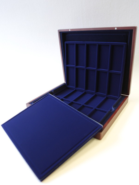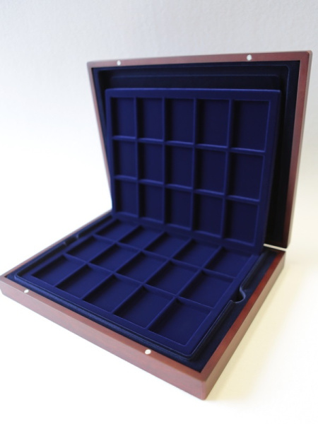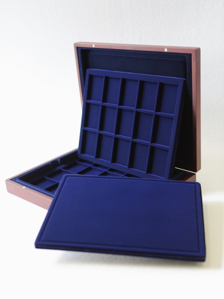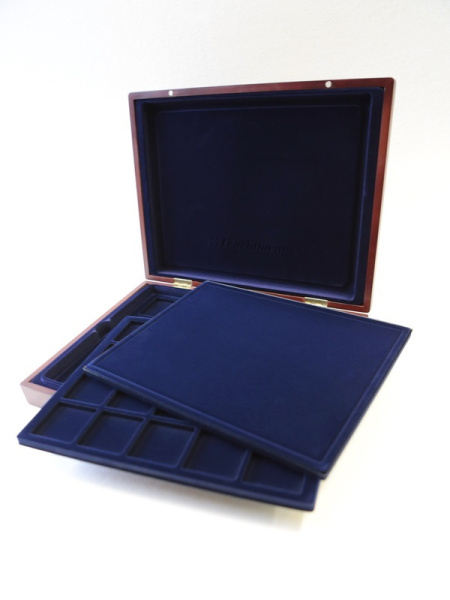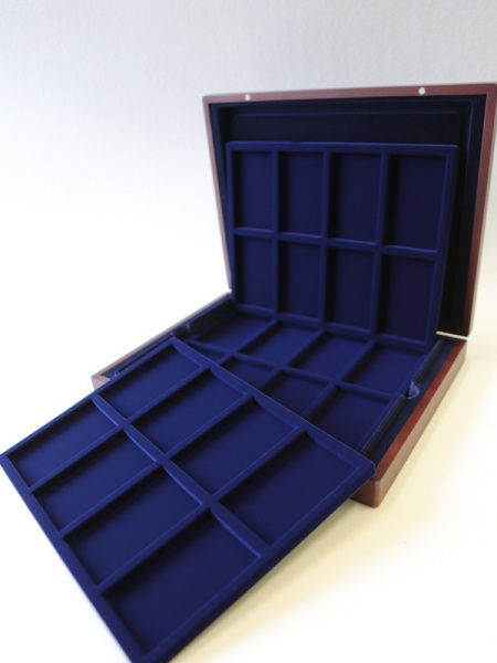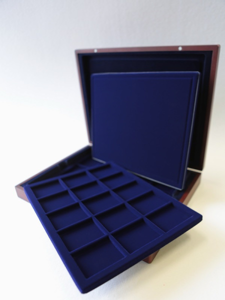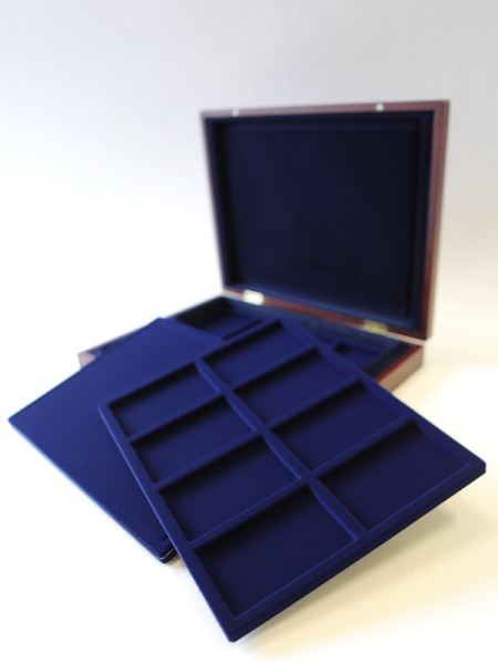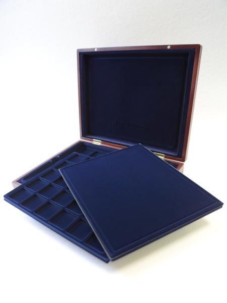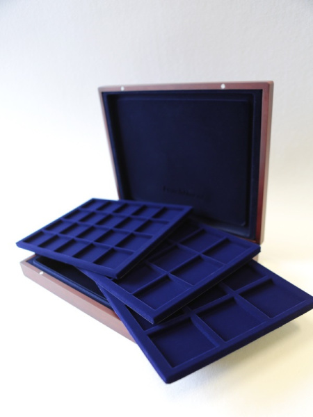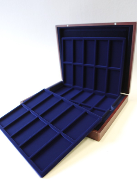 Подушечка из шёлка синего цвета в крышке, Флокированный уровень в основании футляра, 2 флокированных уровня в деревянных рамах