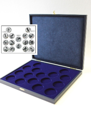 Футляр изготовлен под 4 серии по 4 монеты 3 рубля серебра Сочи-2014 в капсулах.