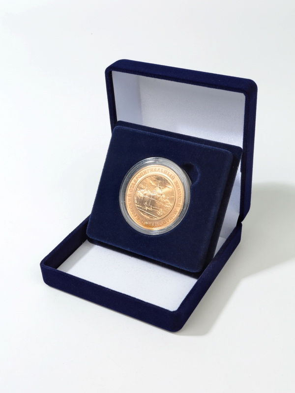 Флокированный футляр с ложементом для одной монеты в капсуле. Внешний диаметр капсулы 46 мм. Ложемент вытаскивается из футляра и может ставиться вертикально.