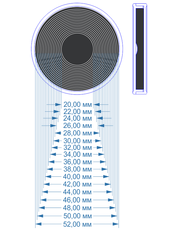 Внутренний диаметр регулируется с помощью съемных вспененных колец: 20 мм, 22 мм, 24 мм, 26 мм, 28 мм, 30 мм, 32 мм, 34 мм, 36 мм, 38 мм, 40 мм, 42 мм, 44 мм, 46 мм, 48 мм, 50 мм и 52 мм