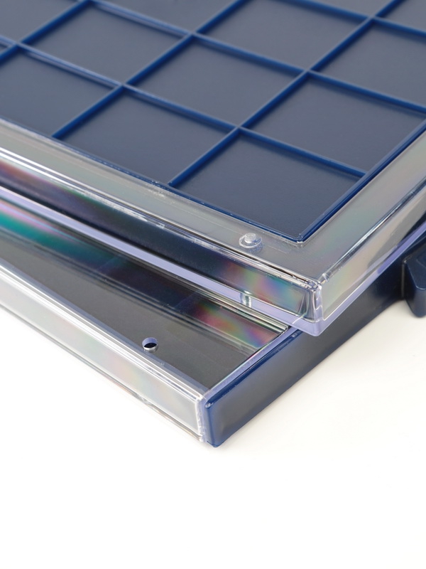 Кассета изготовлена из пластмассы синего цвета, крышка из прозрачного пластика.