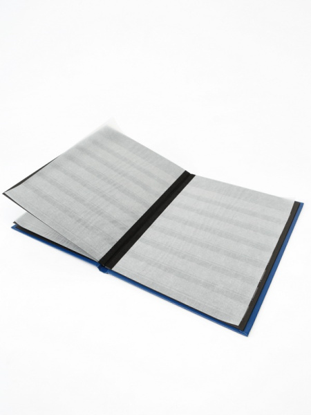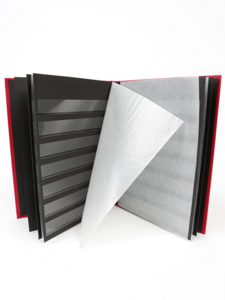 - Внутри располагаются картонные листы с прозрачными пергаминовыми полосками у альбомов с белыми картонными страницами. И прозрачные полимерные полоски у альбомов с чёрными картонными страницами.