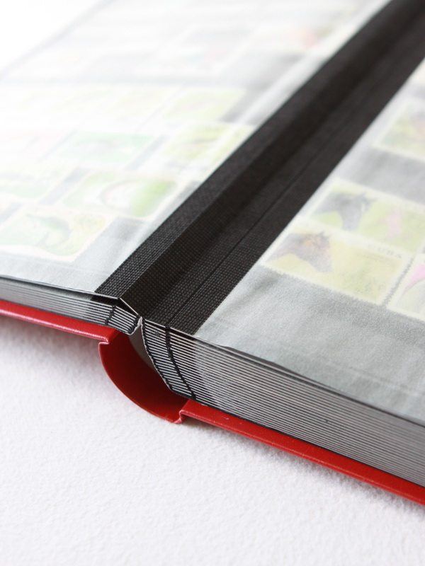 Внутри альбома находятся 32 листа (64 страницы), изготовленные из черного картона с прозрачными полосками (9 полосок из прозрачного пластика на каждой странице).