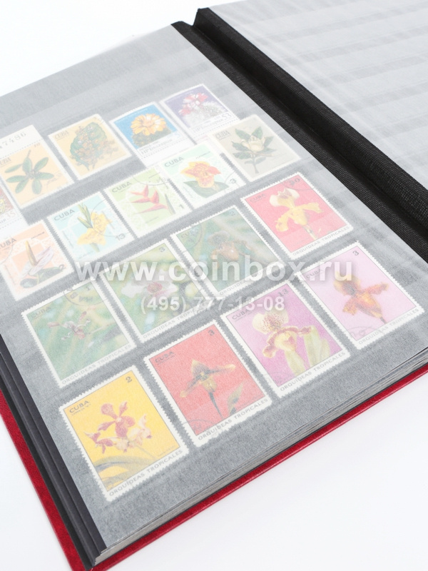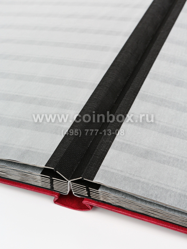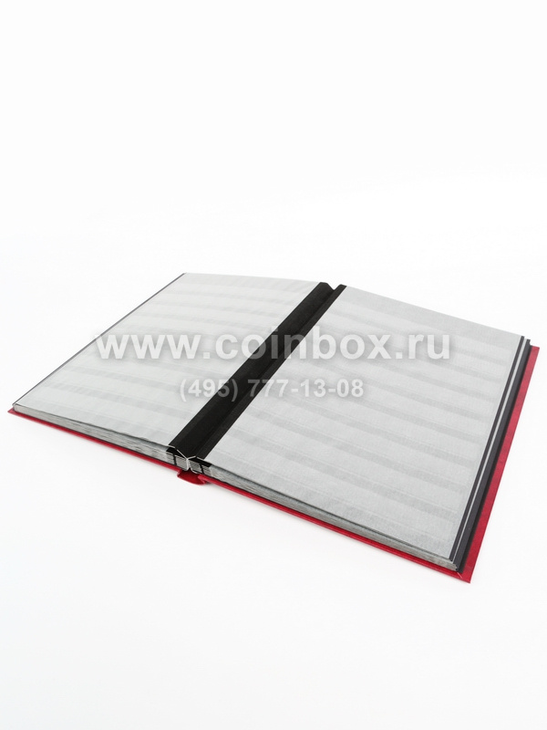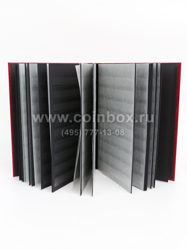 Внутри альбома находятся 16 листов (32 страницы), изготовленные из черного картона с прозрачными полосками (9 полосок из прозрачного пластика на каждой странице).