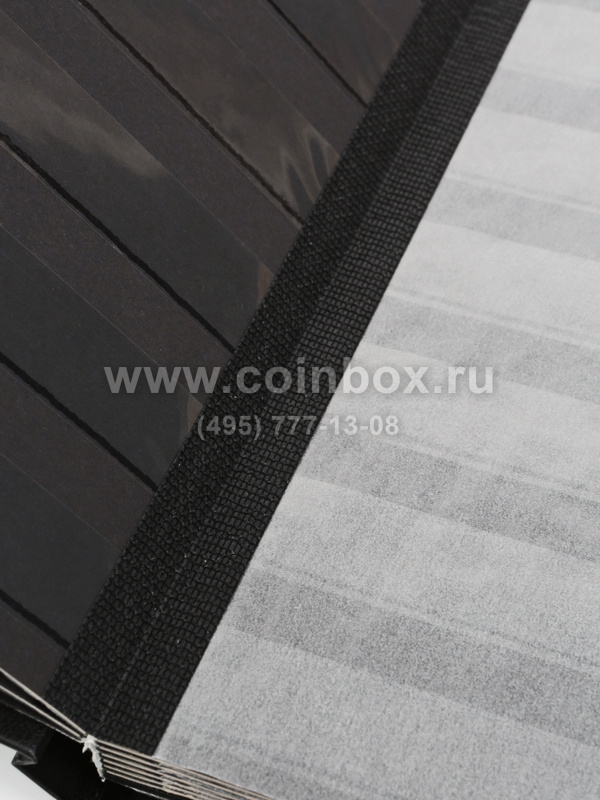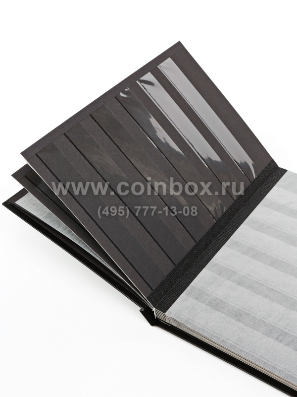 Внутри альбома находятся 8 листов (16 страниц), изготовленные из черного картона с прозрачными полосками (6 полосок из прозрачного пластика на каждой странице).