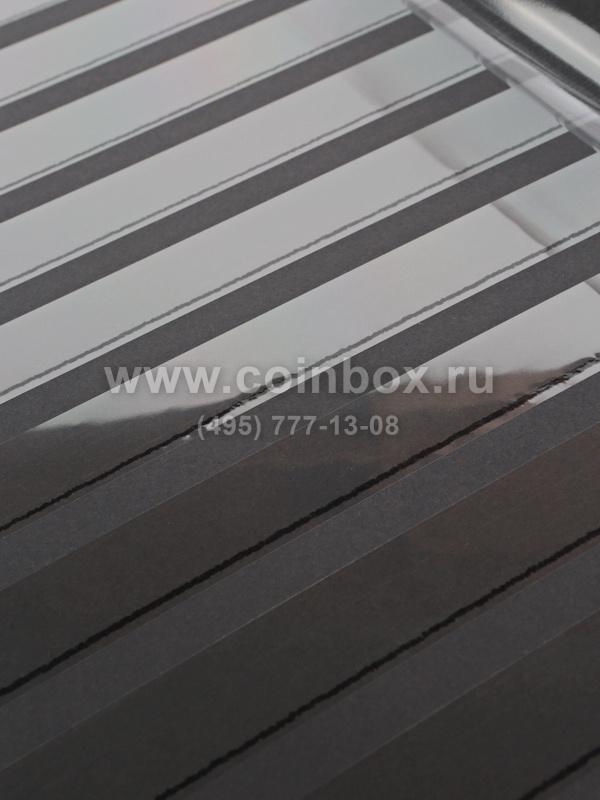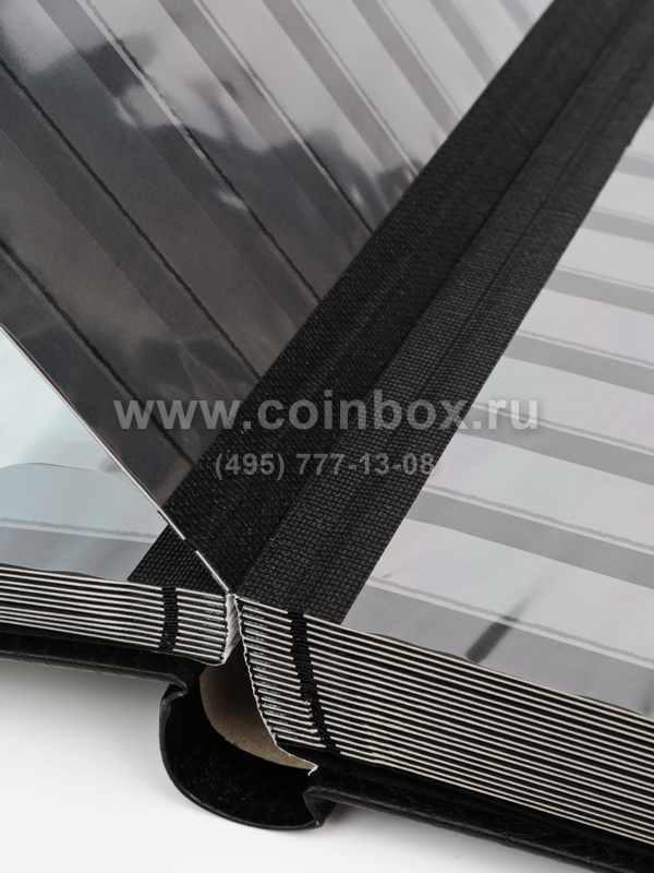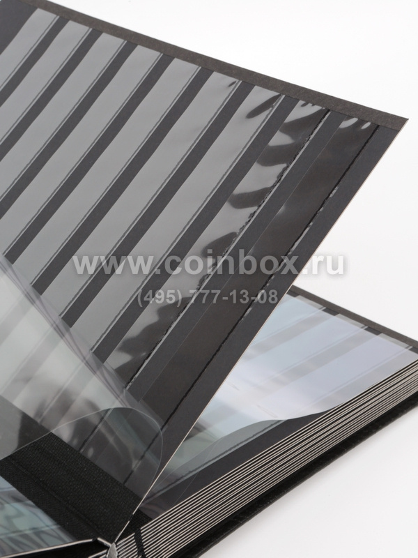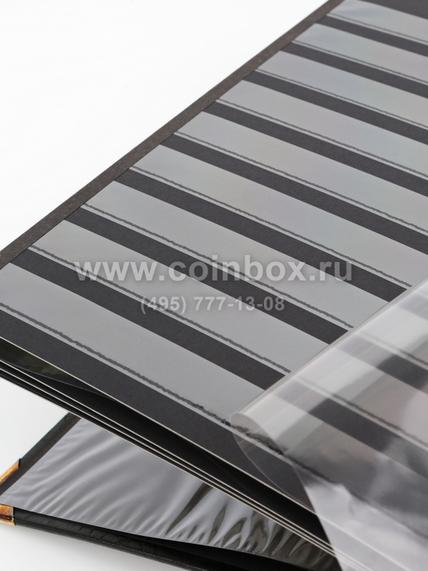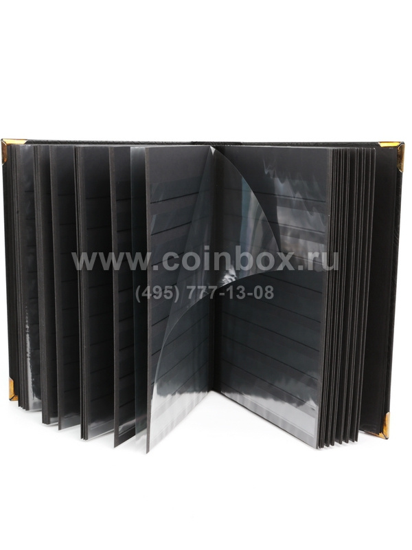 Внутри альбома находятся 30 листов (60 страниц), изготовленные из черного картона с прозрачными полосками (9 полосок клеммташе из прозрачного пластика на каждой странице).
