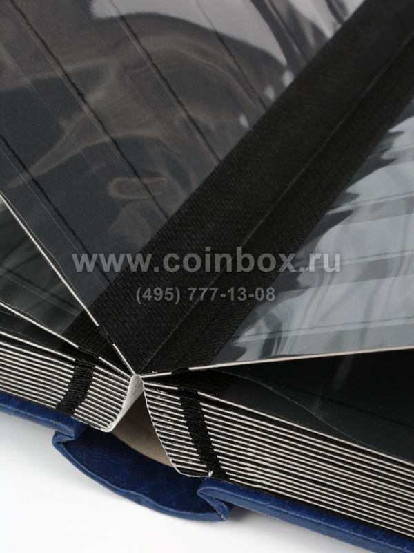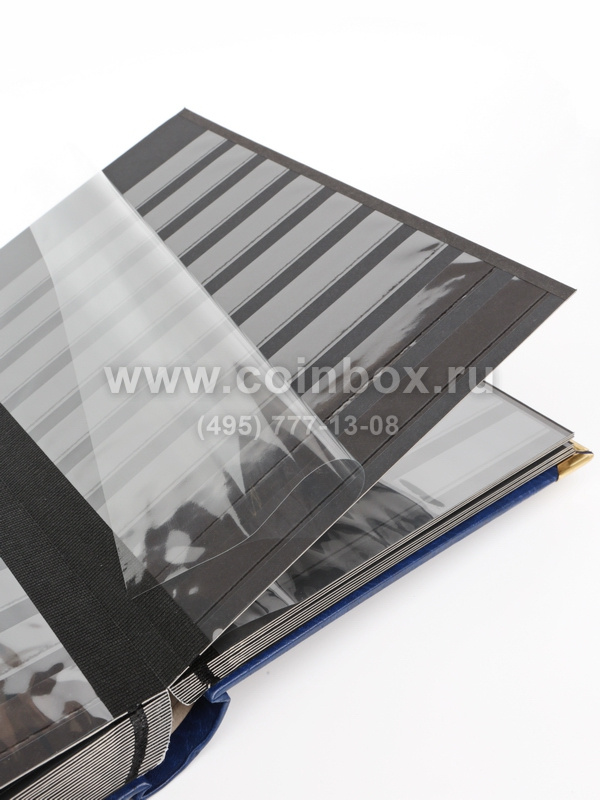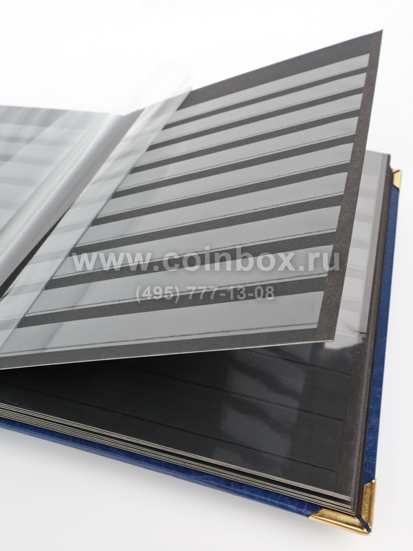 Внутри альбома находятся 30 листов (60 страниц), изготовленные из черного картона с прозрачными полосками (9 полосок клеммташе из прозрачного пластика на каждой странице).