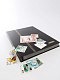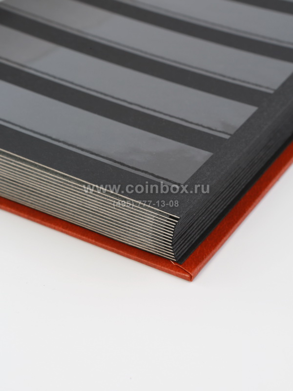 Внутри альбома находятся 16 листов (32 страницы), изготовленные из черного картона с прозрачными полосками (9 полосок из прозрачного пластика на каждой странице).