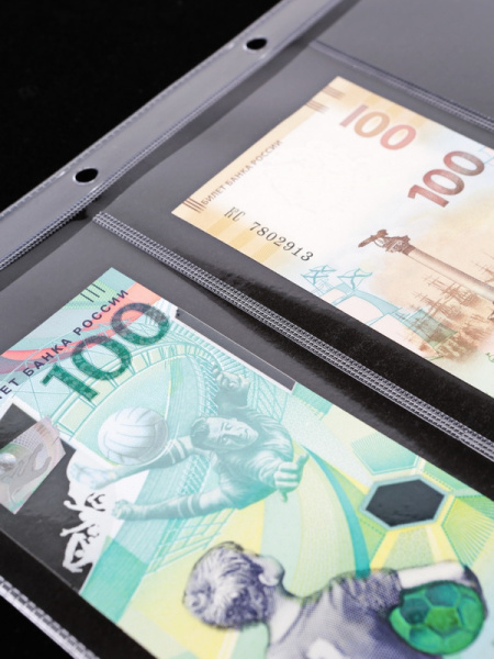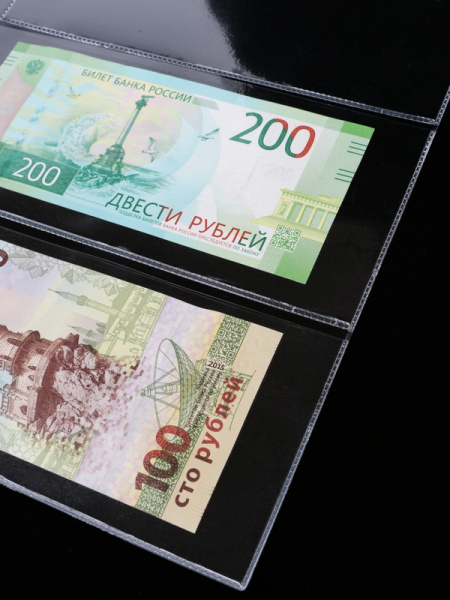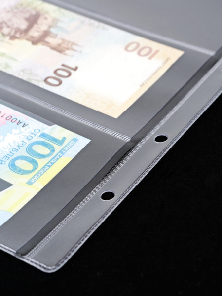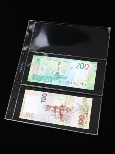 Листы формата ОПТИМА (Россия) из прозрачного пластика для хранения банкнот. Открываются по короткой стороне возле корешка