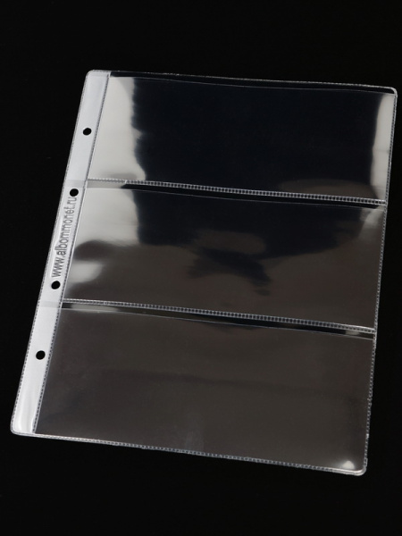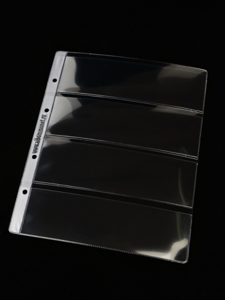Лист формата ОПТИМА (Россия) из прозрачного пластика для хранения банкнот, документов, открыток и других предметов коллекционирования. Открывается по длинной стороне сверху. Лист серии Standart.