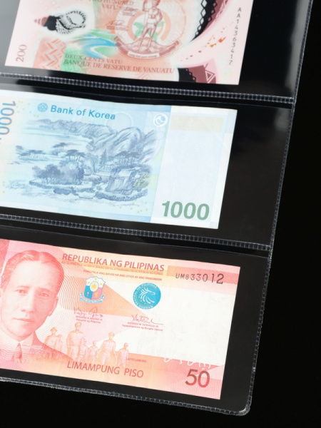 Листы формата ОПТИМА (Россия) из прозрачного пластика для хранения банкнот. Открываются по короткой стороне возле корешка. Упаковка из 10 листов.