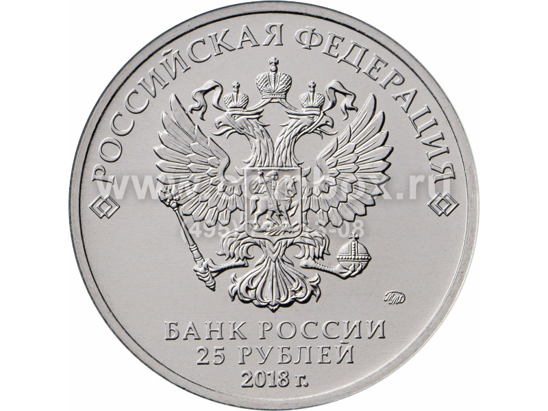 В центре – рельефное изображение Государственного герба Российской Федерации, над ним вдоль канта – надпись полукругом: "РОССИЙСКАЯ ФЕДЕРАЦИЯ", обрамленная с обеих сторон сдвоенными ромбами, справа – товарный знак монетного двора, внизу под гербом в центре в три строки – надпись "БАНК РОССИИ", номинал монеты: "25 РУБЛЕЙ", год: "2018 г.".
