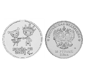 6 ноября 2013 года Банк России выпускает в обращение памятные монеты из недрагоценных металлов номиналом 25 рублей с годом чеканки "2014", посвященные XXII Олимпийским зимним играм и XI Паралимпийским зимним играм 2014 года в г. Сочи.
