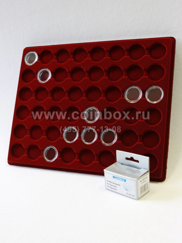 Планшет для хранения 48 капсул Leuchtturm (CAPS 22 и 22,5). Также может подойти для монет в других капсулах. Внешний диаметр капсулы должен быть не более 28,5 мм. Подходит для монет: 10 руб Банк России (диаметр монеты 22 мм).