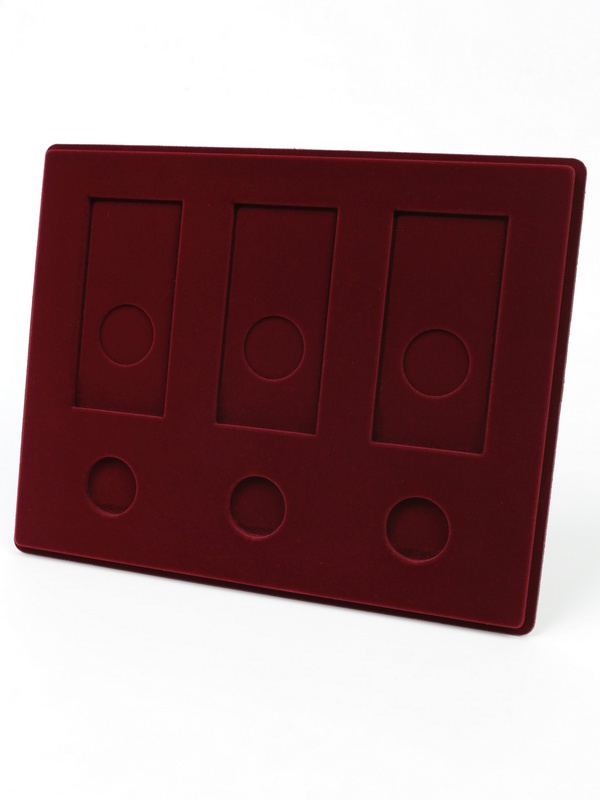 Планшет подходит для хранения 3 обычных монет 25 рублей в капсулах Leuchtturm и 3 цветных монет 25 рублей в блистере (в специальном исполнении)
