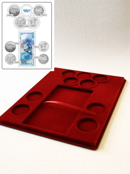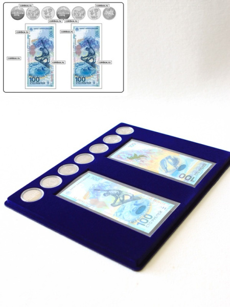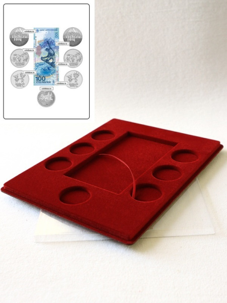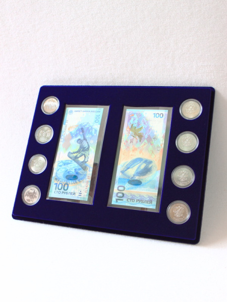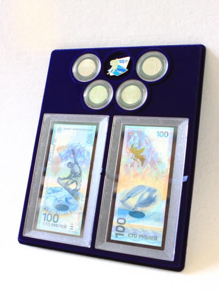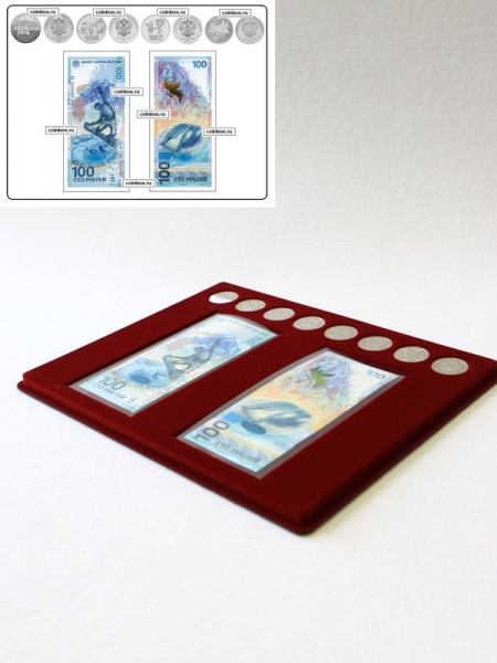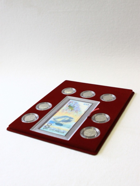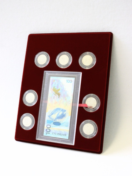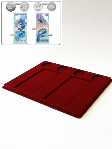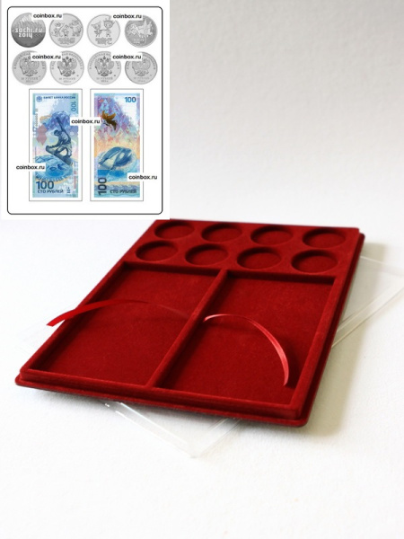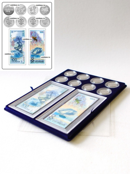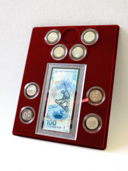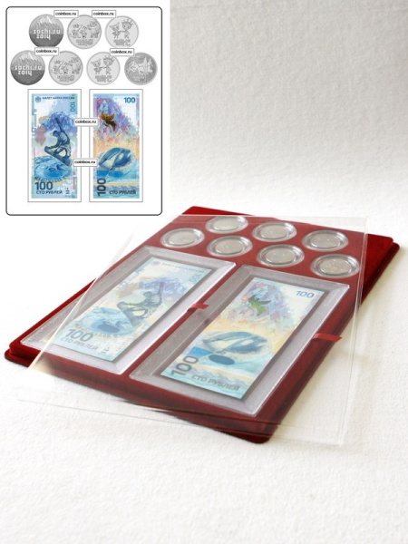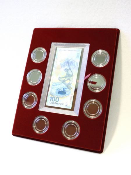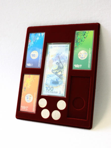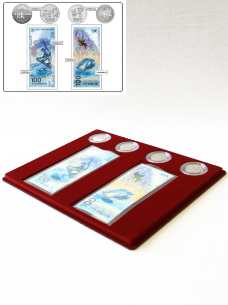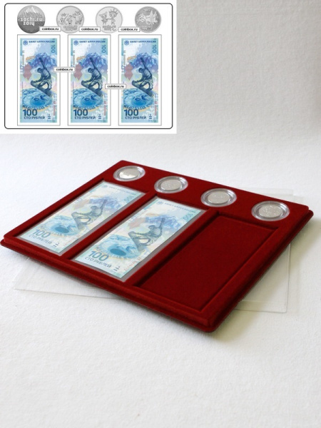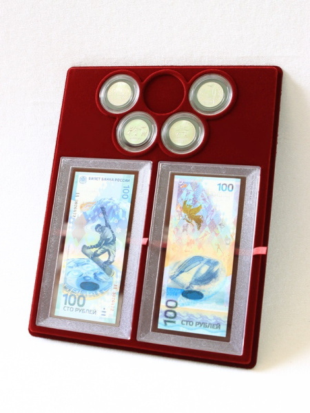 Планшет M (146х236х12 мм) для 4 монет 25 рублей в капсулах Leuchtturm и банкноты «Сочи-2014» в чехле