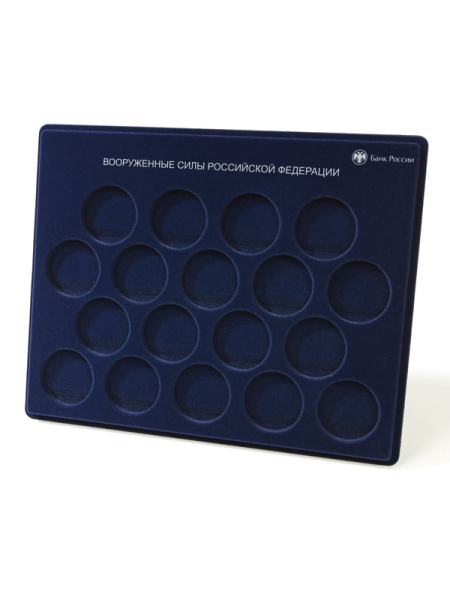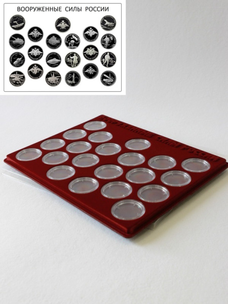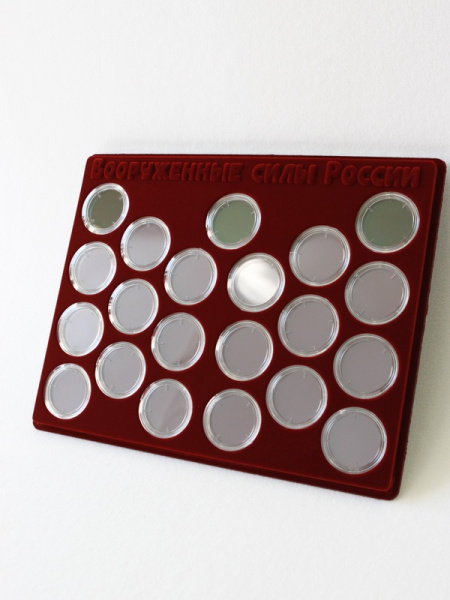 Планшет для хранения монет серии "Вооружённые силы Российской Федерации". Монеты должны быть уложены в капсулы с внешним диаметром 44 мм.