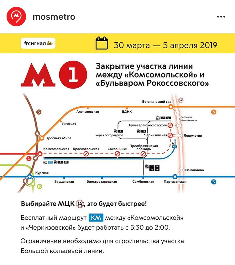 с 30 марта по 5 апреля 2019 года будет закрыт участок Сокольнической линии метро между "Комсомольской" и "Бульваром Рокоссовского".Выбирайте МЦК, это будет быстрее!