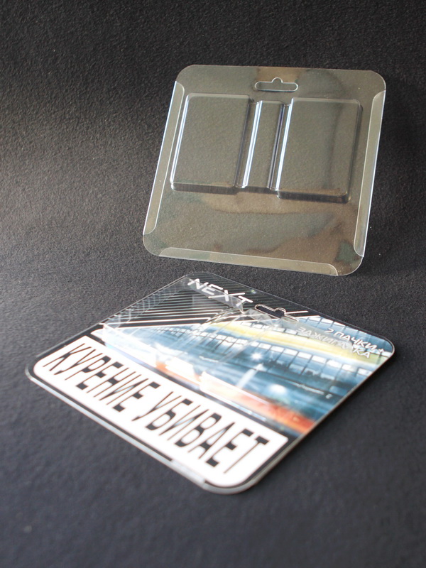 Блистер для промоакции компании "NEXT". В блистер вкладываются 2 пачки сигарет и зажигалка.