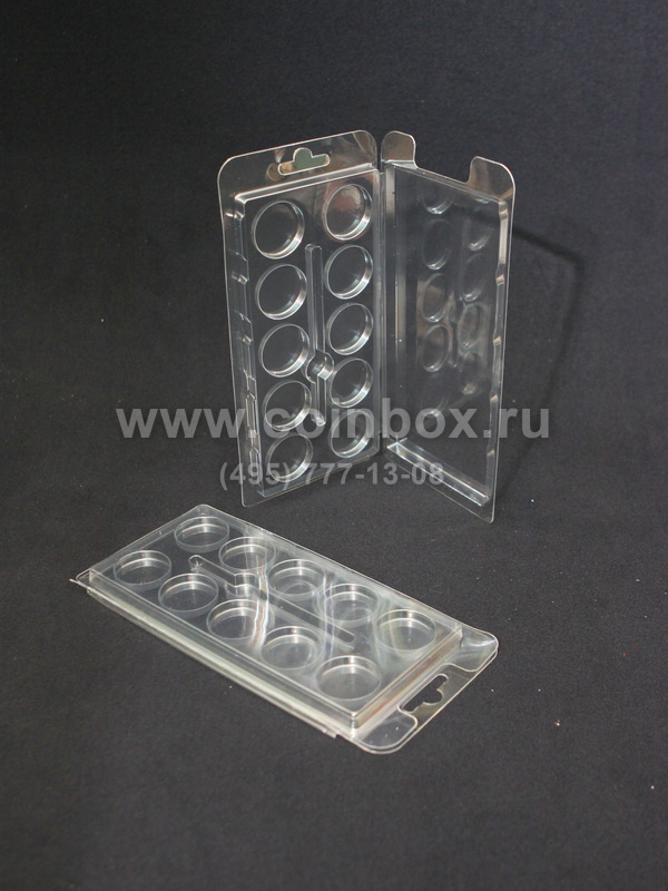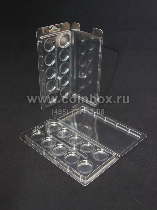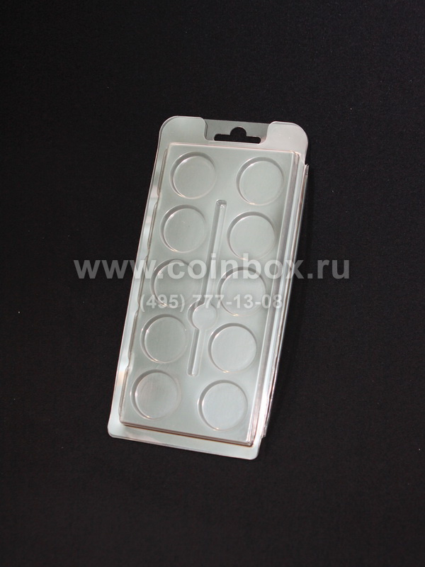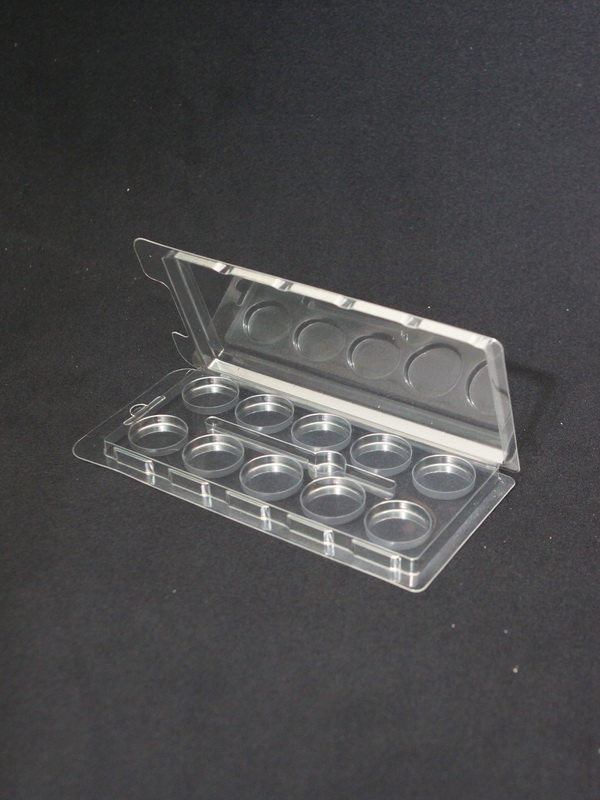 Данная упаковка имеет форму складного двухстороннего блистера. Блистер рассчитан для хранения десяти баночек с косметикой и кисточки.