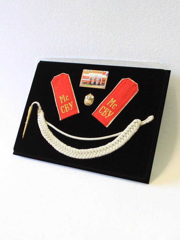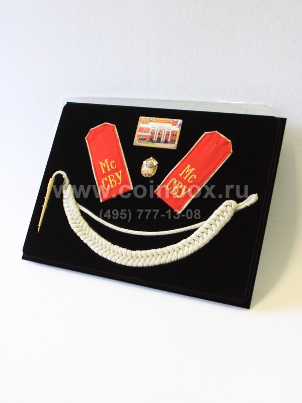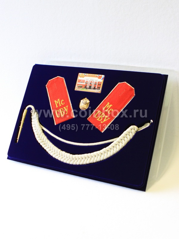 В сувенирной упаковке сделаны углубления под погоны, магнит с изображение Суворовского училища, знак на винте, аксельбант.