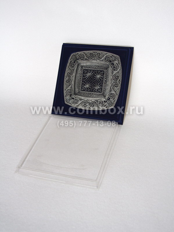 Верхняя часть упаковки выполнена из флокированного пластика, снизу к упаковке приклеен белый глянцевый картон. Готовый футляр сверху накрывается прозрачной пластиковой крышкой.