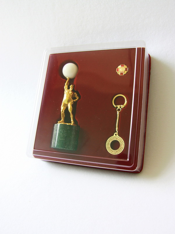 Данная упаковка была изготовлена под комплект сувениров (статуэтка, брелок на цепочке и значок).