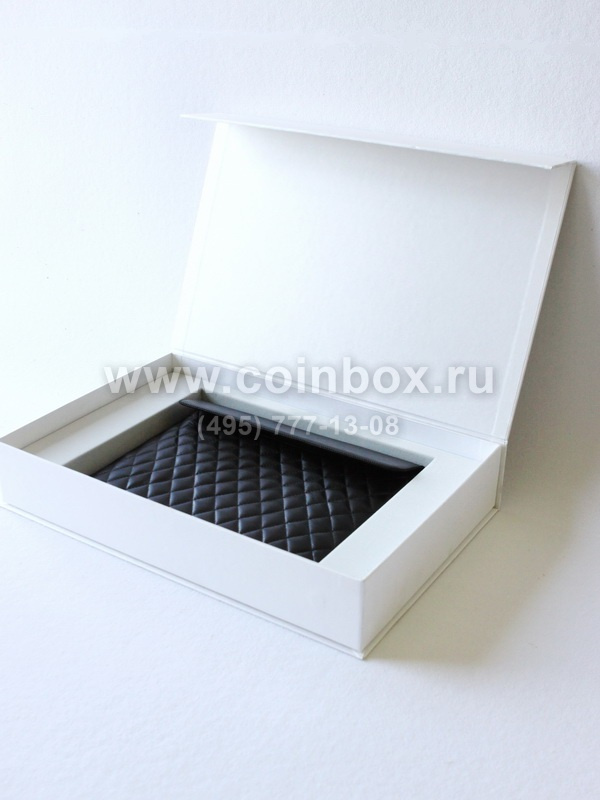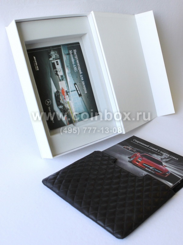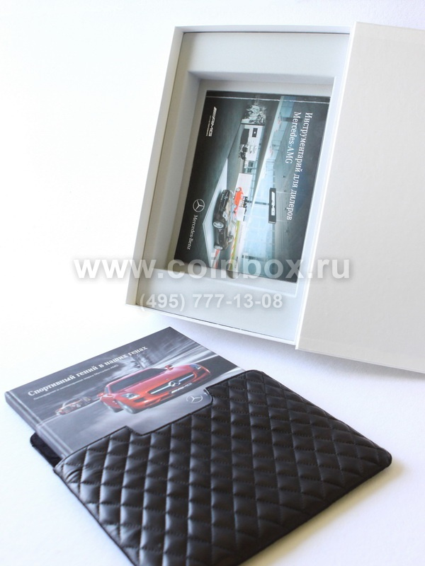 В ложементе сделаны углубления под инструментарий и кожаную папку с книгой. Ложемент изготовлен из серого флока. Ложемент вставляется в картонную коробку заказчика