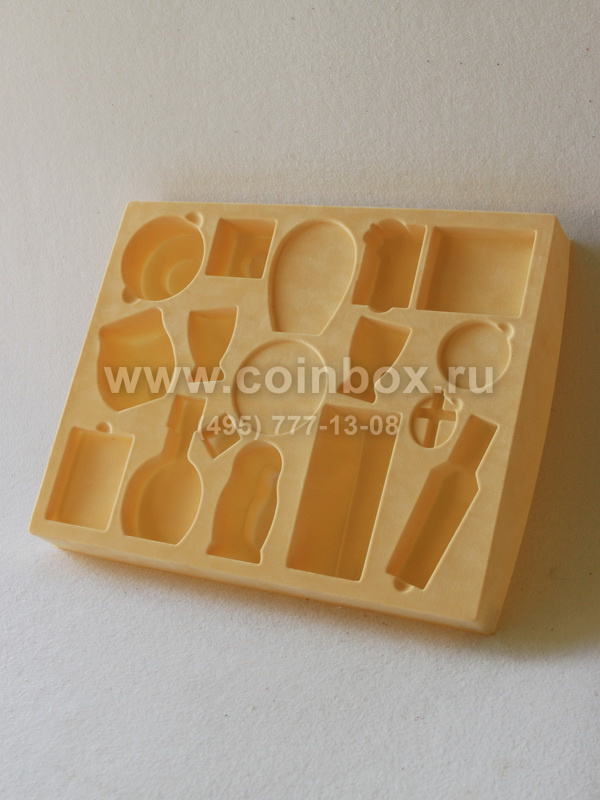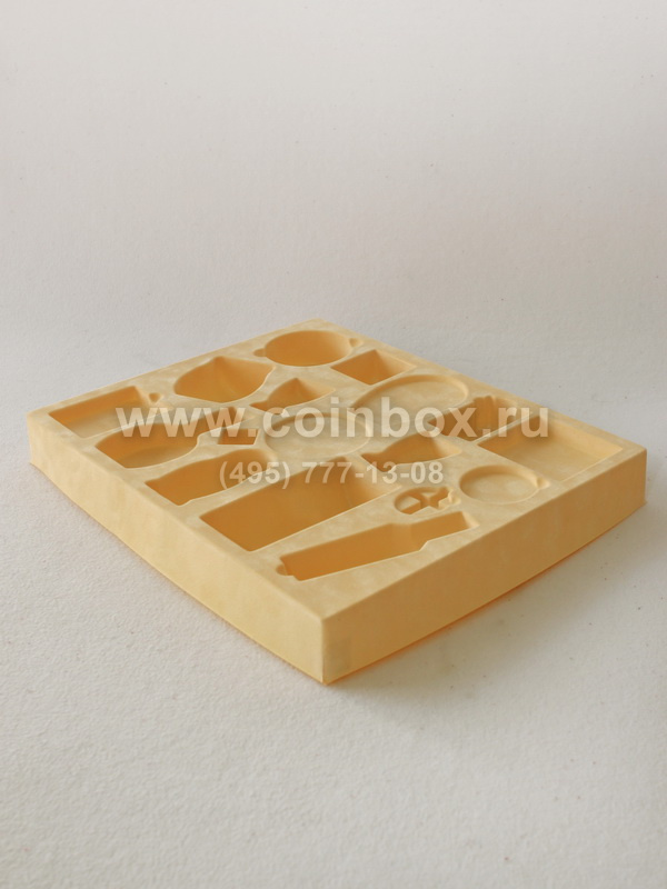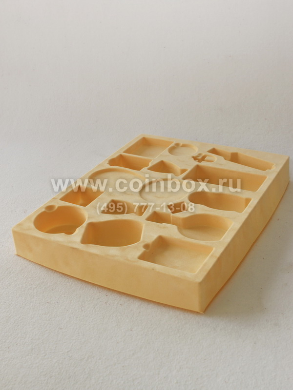Флокированный ложемент в деревянный футляр под подарочный набор «Из Алтая с любовью». Все ячейки сделаны по форме изделий. Цвет ложемента на фотографии бежевый с пятнами-разводами.
