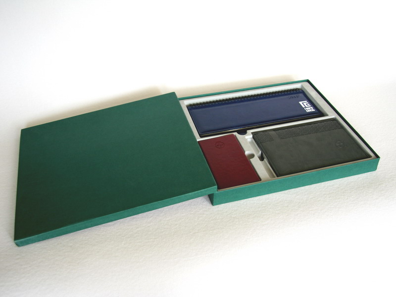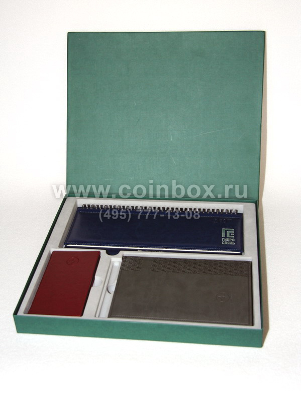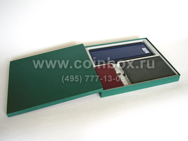 В картонную коробку изготовлен флокированный ложемент серого цвета под набор из 4 предметов (ежедневник, планинг, записная книжка и ручка).