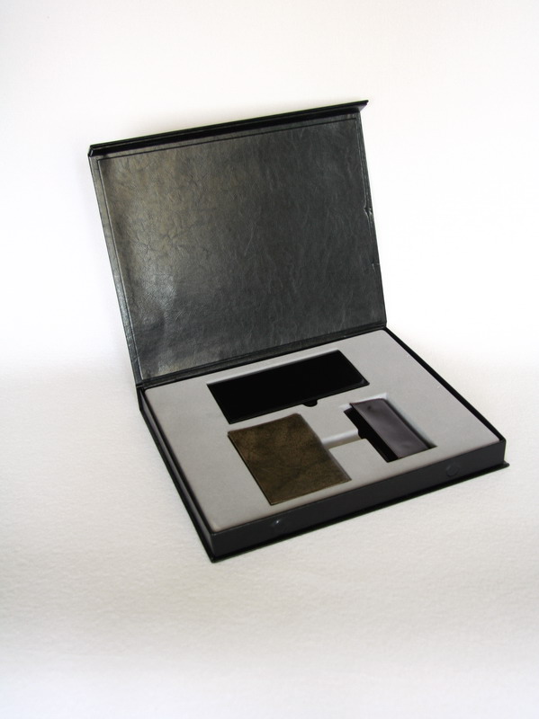 В коробку, обклеенную кожей, изготовлен флокированный ложемент для 3 предметов.