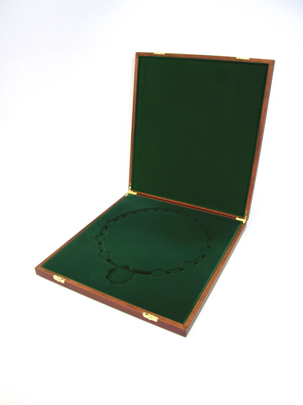 Деревянный футляр с индивидуальным флокированным ложементом под цепь ректора университета.